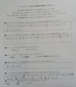 施術後のお客様の反応は いつも嬉しく感じています。 心地よく感じて頂いた時は 必ず私自身も癒された感覚があるので。 最初の頃、 私が緊張していたのが 伝わってしまって施術後 「私が緊張した…」と言われたこともあったなぁ…。 あ、その時は 親しい知り合いに モニターになってもらった時で 素直に伝えてくれ、本当にありがたい存在でした。 今は、嬉しいお声をたくさん頂いています。 今日もゆる~く楽にいきましょー♪ ヘッドセラピーのご感想 ↓ (宇城市 40代 女性 篠崎一枝さま)